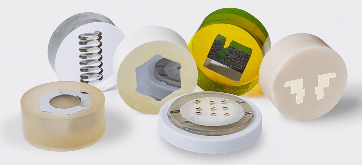 - Resinas termoplásticas para la embutición en caliente a fin de obtener una visión clara de la muestra o del pulido electrolítico